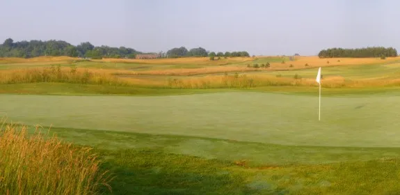 The finishing hole also happens to be the most difficult on the course. It has been know to ruin many good rounds! A long par 4 dogleg right that demands an accurate tee shot. The long hitters may elect to cut the corner, but you better hit it good! Anything off line has a good chance of being in big trouble. The green is protected to the right by a bunker and to the left and behind by native grasses.